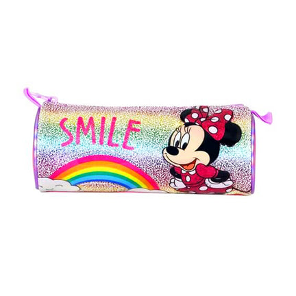 Cyclinder-shaped pencil case with a shimmering exterior is printed with an image of Minnie Mouse