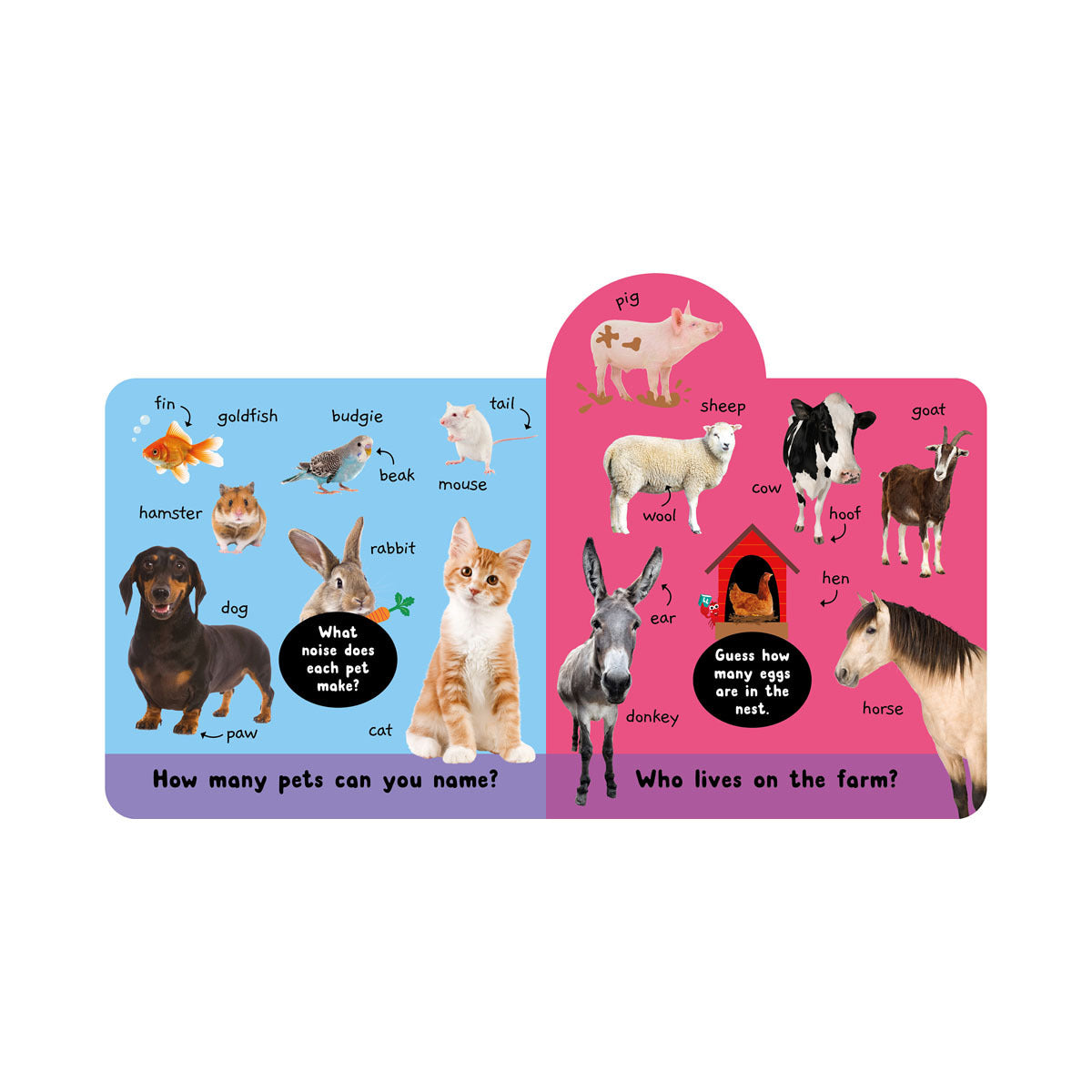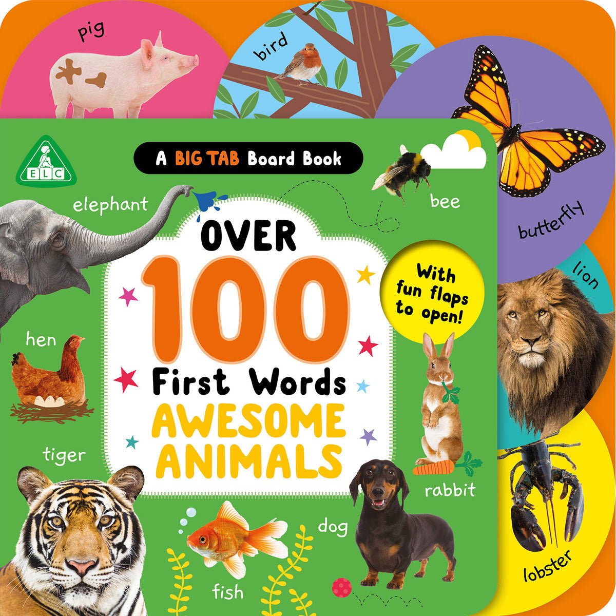 This Early Learning Centre 100 Words Awesome Animals big tab board book features over 100 first words focussed on different species of animals to develop and expand young childrens vocabulary.