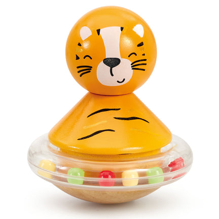 This colourful little toy is great for little hands to hold. With a friendly tiger face, your little ones will love to spin and shake this wooden toy and listen to the beads rattle inside. Just twist the tiger and watch him spin or tap him to watch him wobble.