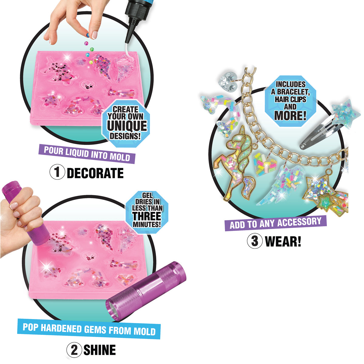 GEMEX magically sets from gel to gems in just a few minutes. Create your gems by carefully squeezing the liquid magic into the mould and adding decorations. Then shine the magic UV light and the gel will harden in just 3 minutes! Pop your gems out of the mould and attach them to hairclips, necklaces, keychains, and more to create your very own unicorn accessories!