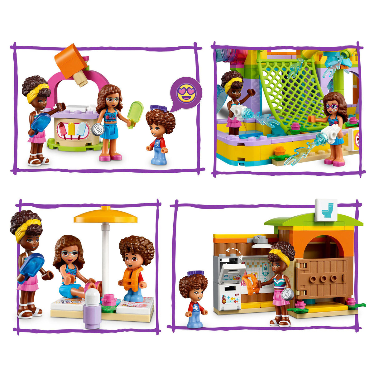 LEGO Friends Olivia and Nandi mini-dolls can help little Santiago on the climbing net and aim the water cannon at Nandi to give her a soaking. Then the friends can cool down with a treat from the ice lolly stand before relaxing under the parasol.