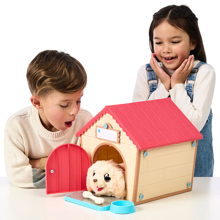 It looks like someone has just arrived! Theres just a couple more things to do - name your puppy and attach their name plate to the kennel. Now its time for the real surprise to happen. Whats that sound coming from inside? Open the door - wow! A cute pet puppy has appeared from nowhere for your child to adore. Which pup will they get? Will they be brown or blonde?