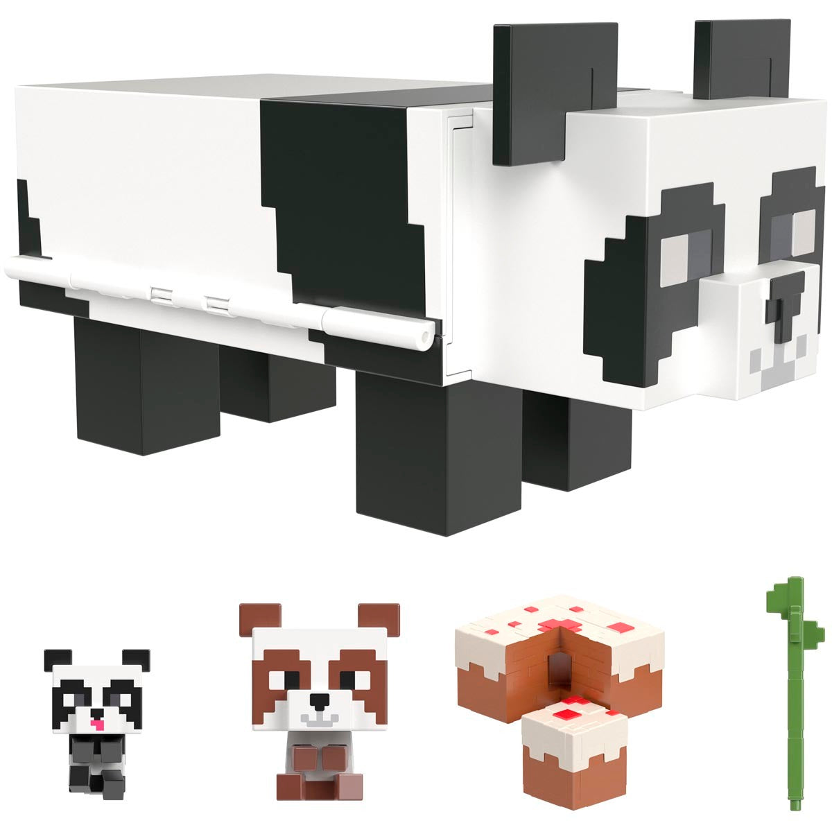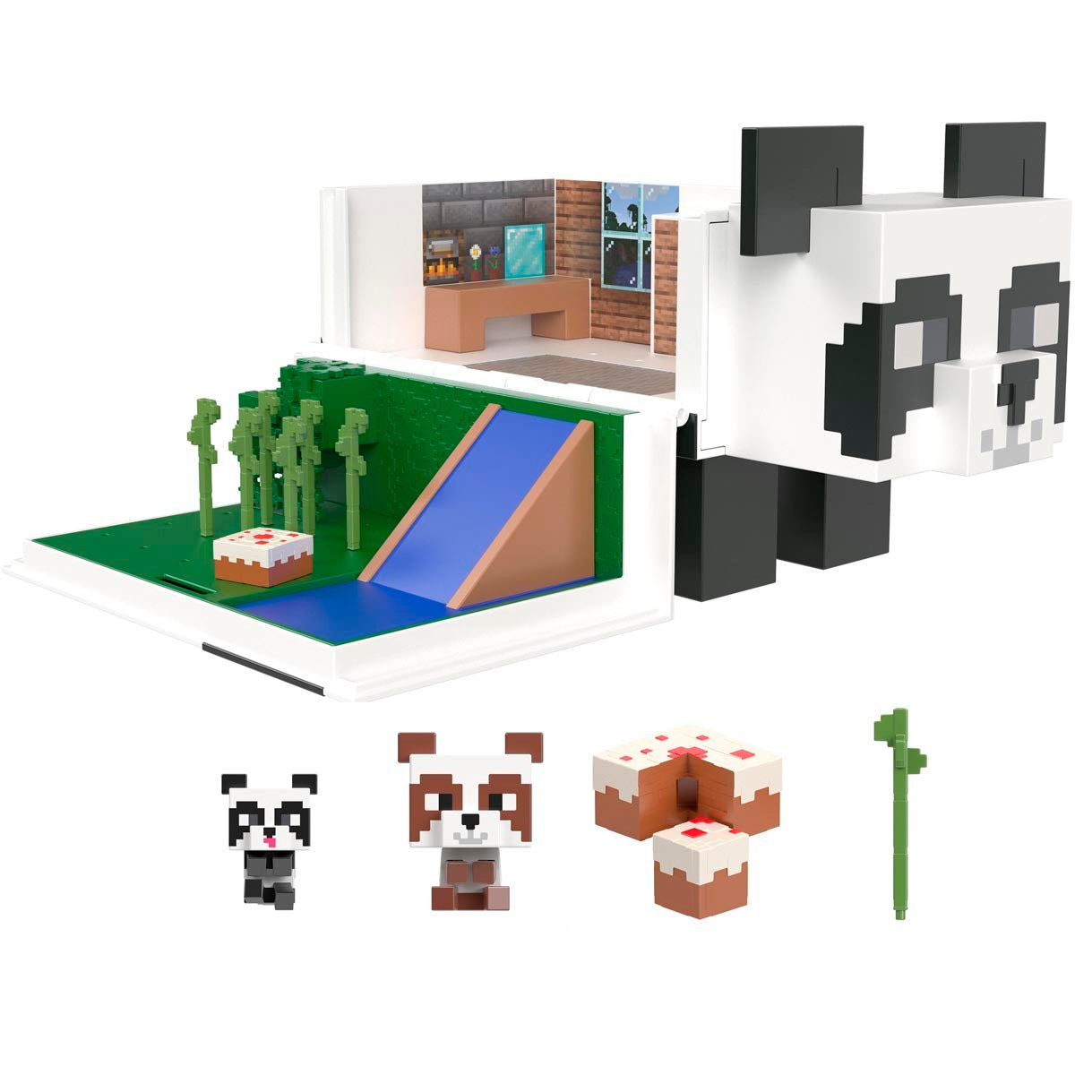 Includes: 1 Minecraft Panda Playhouse playset, 2 Panda figures, bamboo pieces and furniture