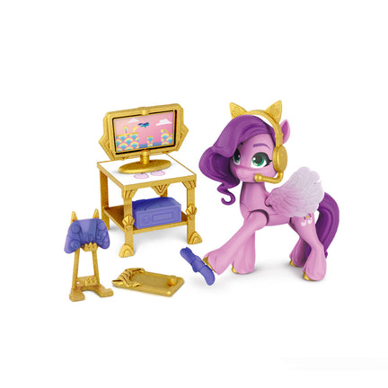 Inspired by the My Little Pony: A New Generation movie, this playset features Princess Pipp Petals, a stylish and talented pop star. Her dream bedroom features a colourful surprise! Discover hidden colours and designs that fade after 10 minutes for repeatable fun. The poseable figures plastic purple hair is curled in her signature style.
