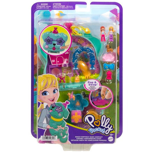 Includes: Polly Pocket Doggy Birthday Bash Compact playset, 12 accessories and 2 micro dolls