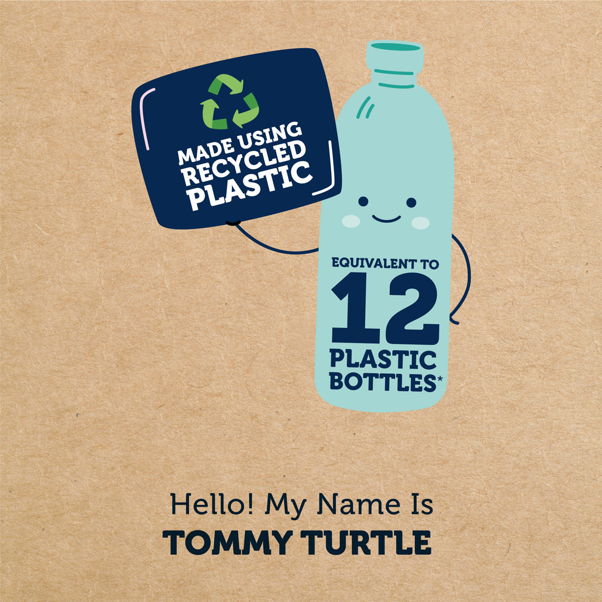 Tommy Turtle is known for his calming aura and patience which he often uses to collect the most beautiful seashells he can find on the ocean floor. Tommy has super-soft fur, sweet, embroidered features and a fluffy sea-green shell, perfect for cuddles and snuggles. Why not help him find a shell he’ll love? Here’s a clue – his favourite colour is sunshine yellow. Made using recycled materials equivalent to 12 plastic bottles*.