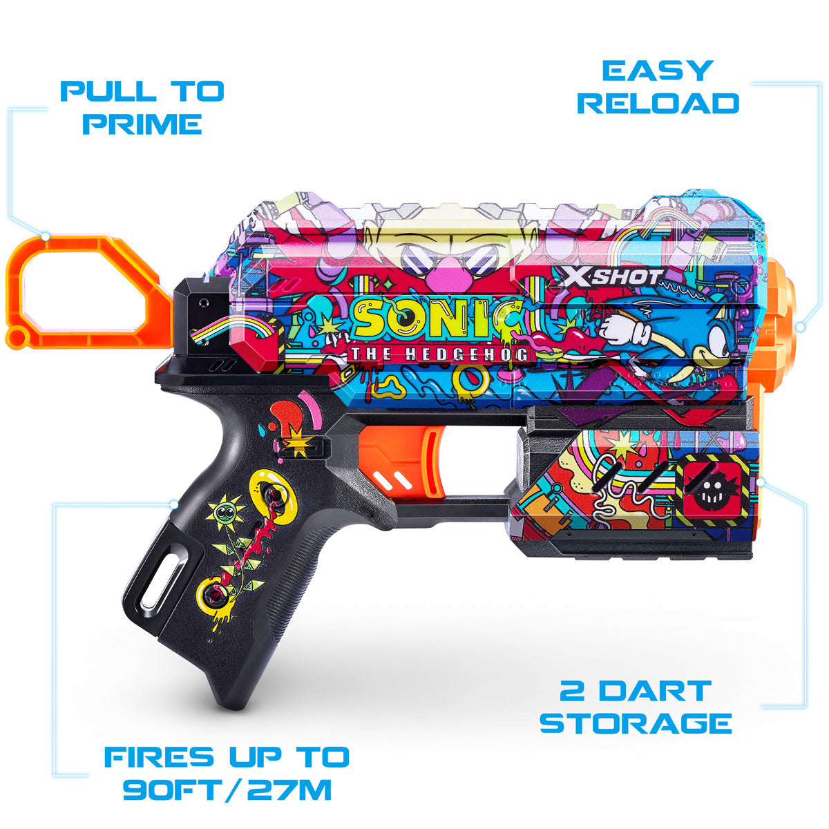 Includes: 1x XSHOT Skins Flux Sonic The Hedgehog Blaster 8x XSHOT Air Pocket Technology Foam Darts